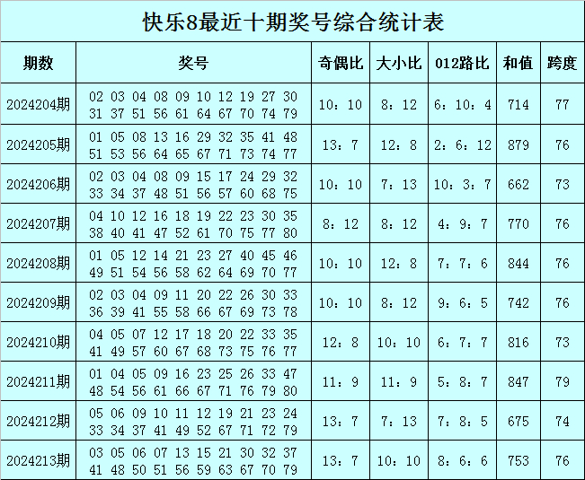 福彩快乐8第2024213期开出奖号:03 05 06 07 13 15 21 30 32 37 41 48 50 51 56 59 63 67 70 79,其中奖号奇偶比开出13:7,大小比开出10:10,和值开出753,跨度开出76,012路比开出8:6:6。