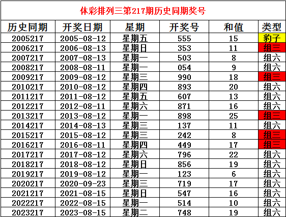 2024年8月14日排列三第217期开奖,历史同期分别开出奖号:
