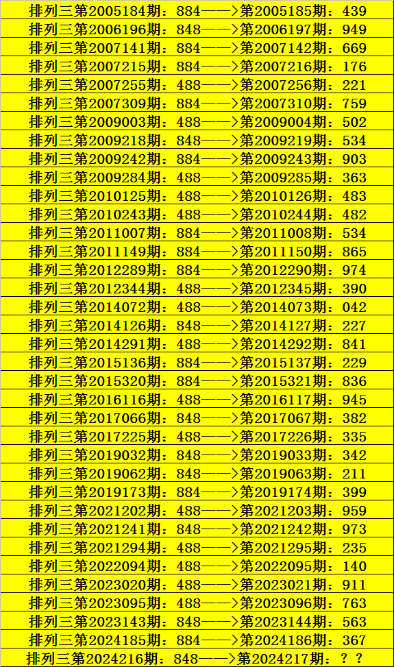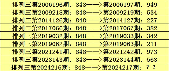 第2024216期排列三奖号为848,历史上该号码直选出现9次,下期奖号分别为:949、534、227、382、342、211、973、563。