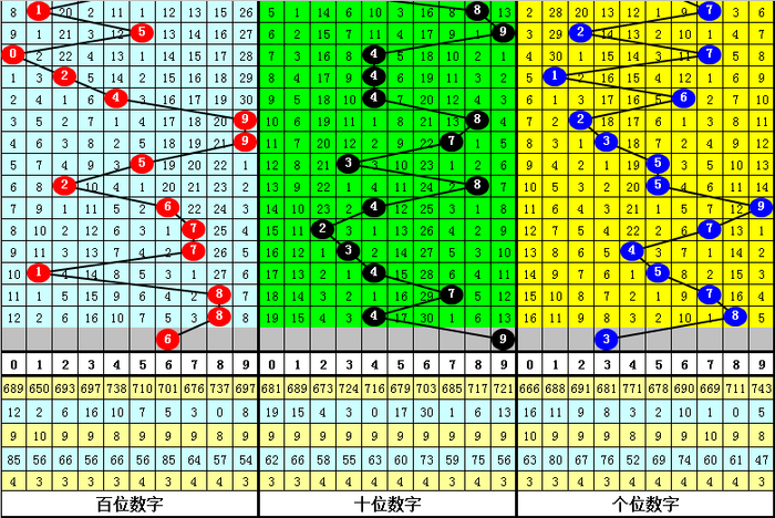 百位:当前遗漏最大的号码为3,遗漏16期,历史上该号最大遗漏为56期,本期百位继续排除号码3。