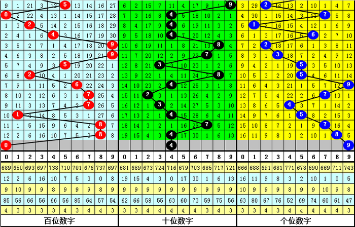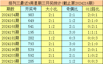 三、体彩排列三前9周星期三奖号分别开出:983-649-541-195-282-793-539-592-285,其中号码012路比为10:5:12,奇偶比为17:10,大小比为16:11;