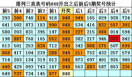 四、排列三直选号码848历史上开出9次,其前后五期奖号分别为: