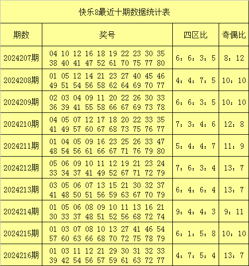 快乐8第2024216期开出奖号:01 03 11 12 21 29 30 31 32 33 39 42 54 56 57 59 61 63 72 77,其中奖号和值为783,跨度为76,012路比为11:3:6,四区比为4:7:5:4,奇偶比为13:7。