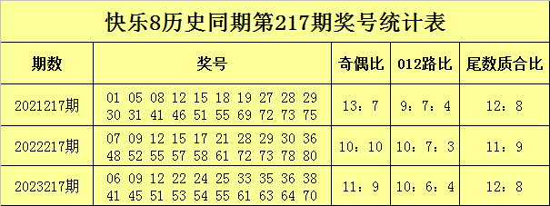 第17、18位号码分析:历史同期第217期分布在61-73之间,其中奖号奇偶比为4:2、012路比为4:2:0、尾数质合比为5:1,去年同期开出奖号:61和63,为全奇、1路+0路、全质尾组合,今年第217期预计第17、18位开出偶号+奇号组合,参考两码72+75。