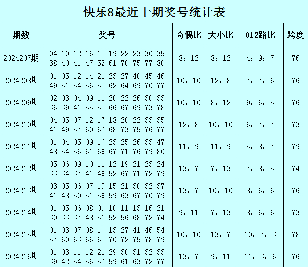 福彩快乐8第2024216期开奖回顾:01 03 11 12 21 29 30 31 32 33 39 42 54 56 57 59 61 63 72 77,其中奖号奇偶比开出13:7,大小比开出9:11,012路比开出11:3:6,和值为783,跨度为76。