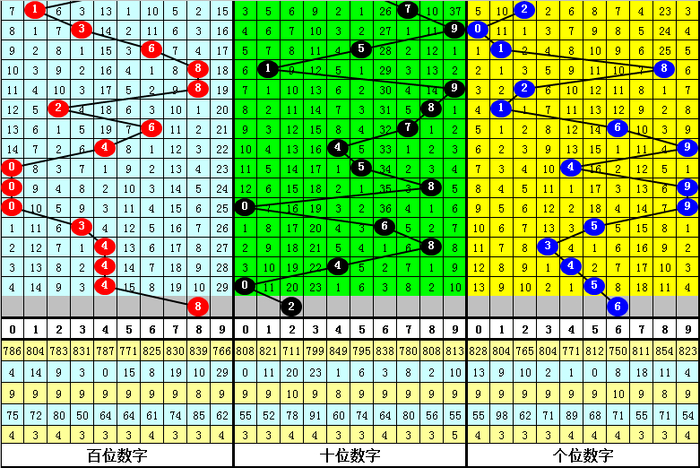 百位分析:上期百位开出奖号:4,最近9期该位奖号大小比为1:8,其中大号6出现1次,5、7、8、9出现0次,小 号4出现4次,0出现3次,3出现1次,1、2出现0次,本期百位参考大号,胆码关注8。