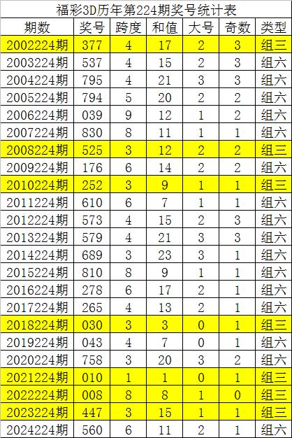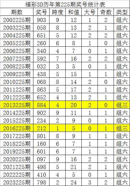 从以上统计可以看出,历年3D第225期开出了2次组三号码,开出了20次组六号码。组六号码出现概率大,本期预计开出组六号码。