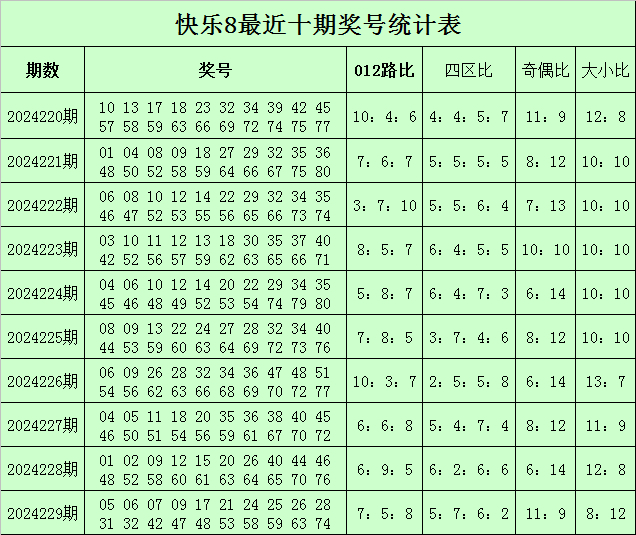 福彩快乐8第2024229期开奖回顾:05 06 07 09 17 21 24 25 26 28 31 32 42 47 48 53 58 59 63 74,其中奖号012路比为7:5:8,四区比为5:7:6:2,奇偶比为11:9,大小比为8:12。