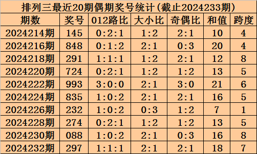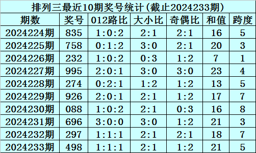 上期回顾:排列三2024233期奖号为498,奇偶比为1:2,大小比为2:1,跨度为21。