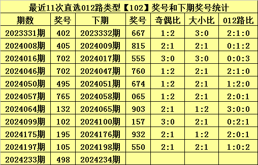 排列三上期开出奖号为:498,其直选012路类型为102,历史上直选102号码已开出了260次,最近11期分别开出奖号为:402、405、702、702、495、765、132、102、195、105、498。