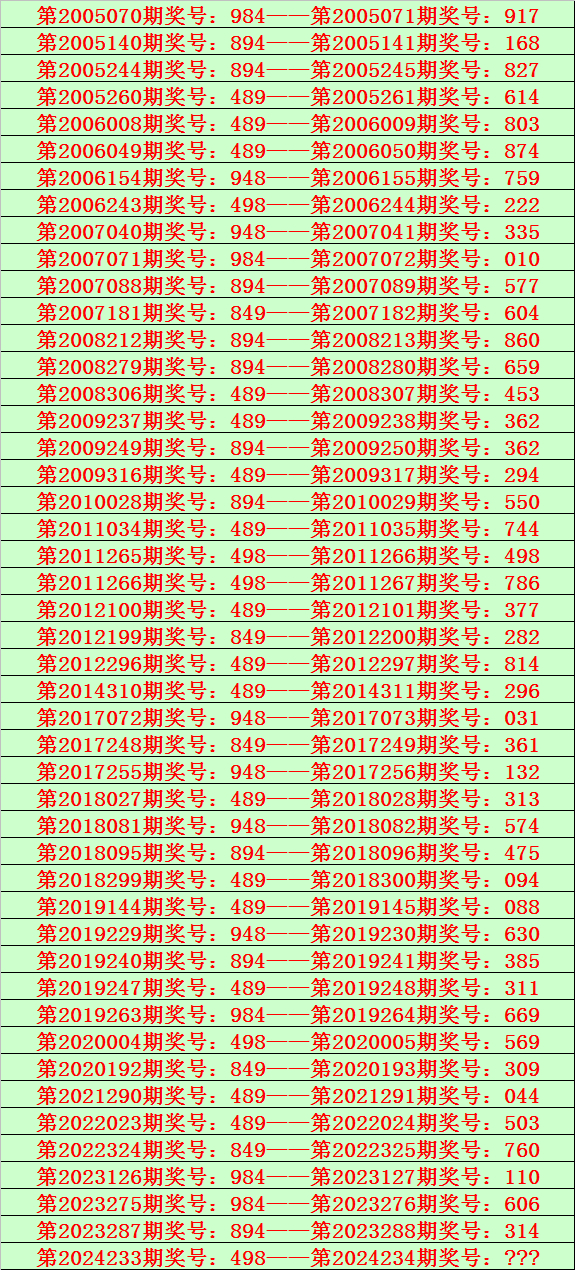 排列三第2024233期开出奖号498,该号码直选类型历史上出现了5次,前4次开出之后期下期奖号为:222、498、786、569,见下表: