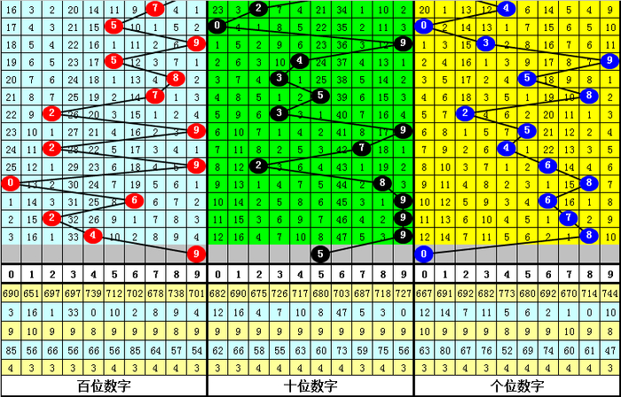 目前百位最冷号码为3,当前遗漏33期,该号码历史最大遗漏为56期,本期百位防号码3解冻。