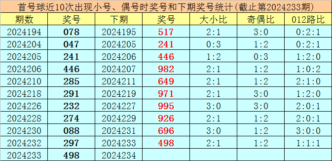 在首号球前10次开出小 号、偶号类型之后,其下期分别开出奖号:517、241、446、982、649、971、995、926、696、498,其中号码大小比为7:3,012路比为6:2:2,奇偶比为5:5。