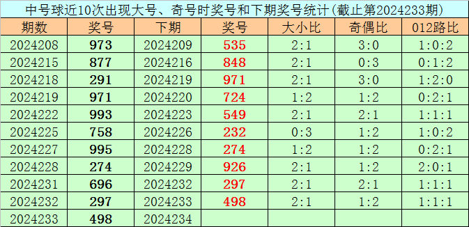 在中号球前10次开出大号、奇号类型之后,其下期分别开出奖号:535、848、971、724、549、232、274、926、297、498,其中号码奇偶比为6:4,大小比为4:6,012路比为4:4:2。