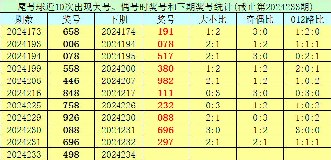 在尾号球前10次开出大号、偶号类型之后,其下期分别开出奖号:191、078、517、380、982、111、232、088、696、297,其中号码奇偶比为4:6,大小比为5:5,012路比为2:4:4。