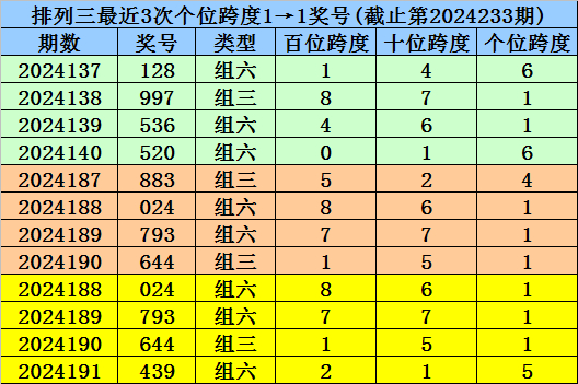 第2024187-第2024189期奖号:883、024、793,其下期奖号为:644,末位号码跨度为1;