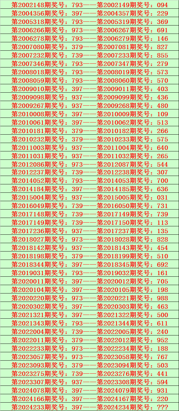 福彩3D第2024234期开奖日期:2024年8月31日,历史上第234期已开出了22次奖号,历年同期号码分别为:452、140、686、890、666、302、076、073、354、211、418、846、580、454、204、895、953、340、671、561、188、109。