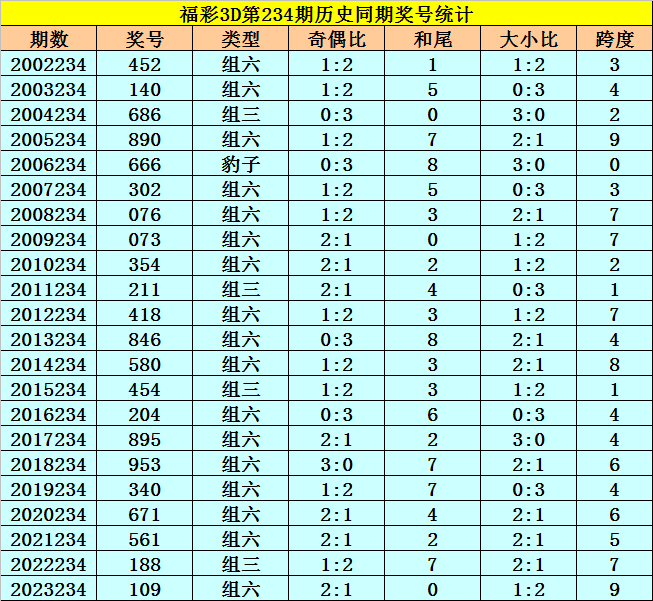 福彩3D历年第234期同期奖号为:452 140 686 890 666 302 076 073 354 211 418 846 580 454 204 895 953 340 671 561 188 109。