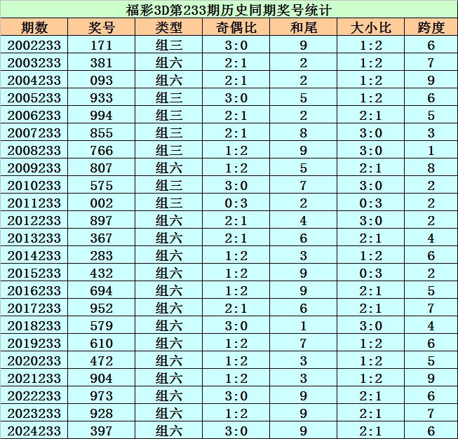福彩3D历年第233期同期奖号为:171 381 093 933 994 855 766 807 575 002 897 367 283 432 694 952 579 610 472 904 973 928 397。