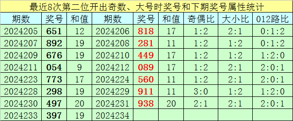 前7次第二位号码开出奇数、大号时奖号分别为:651、892、676、054、773、298、497,其中奇偶总比例为11:10,有1期奇偶比与上期奇偶比相同;号码大小总比例为14:7,有5期奖号大小比与上期大小比相同;