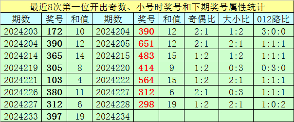 前7次第一位号码开出奇数、小 号时奖号分别为:172、390、365、305、103、380、312,其中奇偶总比例为13:8,每期奖号奇偶比与上期奖号奇偶比都不相等;号码大小总比例为6:15,有1期奖号大小比与上期大小比相同;