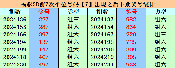 个位分析:上期个位开出奖号7,个位历史上号码7已开出814次,最近100期个位号码开出7次,上期号码遗漏2期出现。