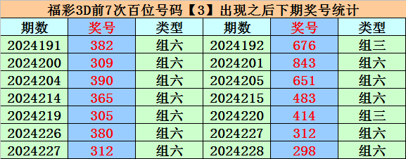 在百位号码3前7次开出之后,其下期分别开出号码:6、8、6、4、4、3、2,其中号码奇偶比为1:6,大小比为3:4,012路比为3:2:2。