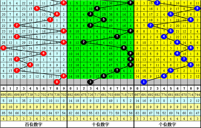 百位分析:该位上期开出号码9,最近10期该位012路比为5:1:4,其中0路号码间隔3期再次出现,本期可以放弃0路号码,注意2路号码开出,参考8。