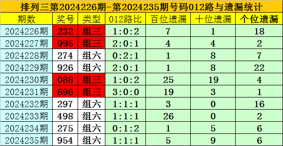 开奖回顾:排列三第2024235期奖号为:954,类型为组六,号码012路比为1:1:1,百十个位号码直选分别遗漏5期、9期和6期。