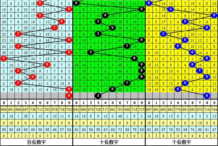 百位分析:上期出现号码9为:大号、合数,在连续9期开奖中,百位分别为:大号、合数:9;小 号、质数:2;大号、合数:9;小 号、合数:0;大号、合数:6;小 号、质数:2;小 号、合数:4;小 号、质数:2;大号、合数:9,其中大号频次较低,合数开出频繁,百位本期预计开出大号、合数。