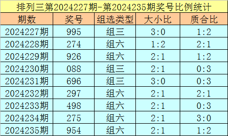 上期回顾:排列三第2024235奖号开出954,奖号质合比为1:2,大小比为2:1,跨度为5,类型为组六。