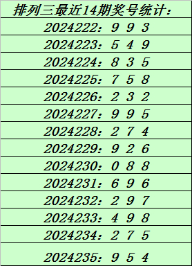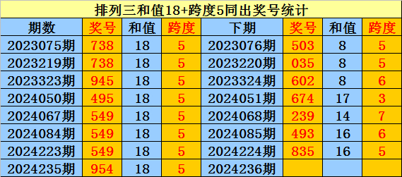 上期回顾:排列三第2024235期奖号:954。和值18,跨度5。