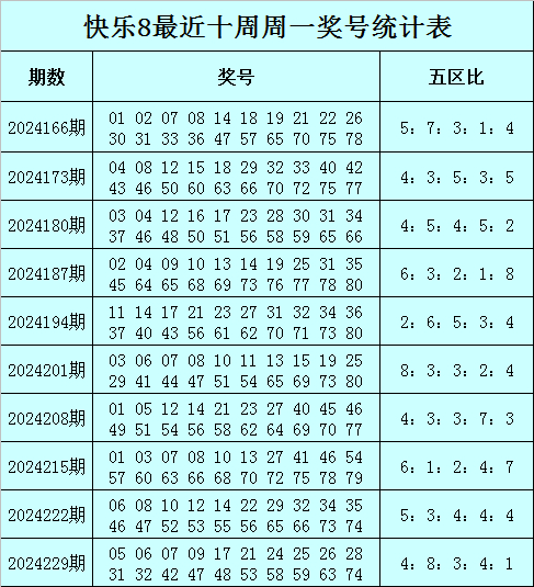 福彩快乐8第2024229期(上周一)开奖回顾:05 06 07 09 17 21 24 25 26 28 31 32 42 47 48 53 58 59 63 74,其中奖号五区比为4:8:3:4:1。