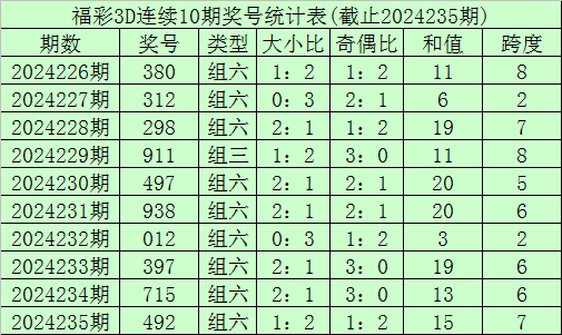 开奖回顾:福利彩票3D第24235期奖号开出492。奖号类型为组六,奇偶形态为偶奇偶,大小形态为小大小。