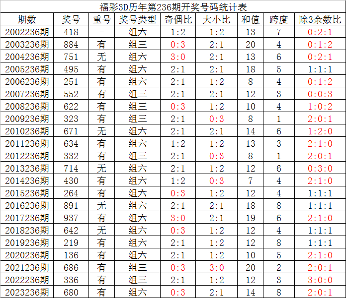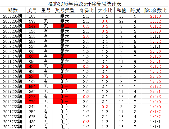 其中,组三号码开出6次,组六号码出现16次,上期奖号为组六号码,本期预计继续开出组六号码。