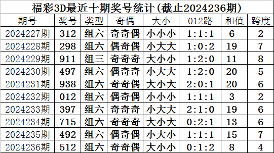 开奖回顾:福彩3D第2024236期奖号为512,奖号形态为:组六、大小小、0:1:2、奇奇偶。