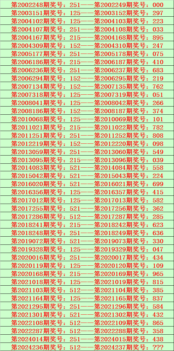 福彩3D第2024237期开奖日期:2024年9月3日,历史上第237期已开出了22次奖号,历年同期号码分别为:662、391、771、767、683、047、699、844、175、662、739、874、260、107、531、135、631、959、396、724、691、096。