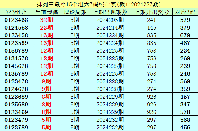 (1)在排列三已开出的7009期奖号中(统计截止第2024237期),目前7码组六遗漏值最大的组合为:0123468,本期遗漏32期;