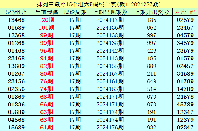 (4)排列三第2024237期遗漏值最大的十个5码组六组合解冻了2个;