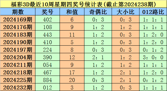 福彩3D第2024232期(上周星期四)奖号为012。其中奖号奇偶比为1:2,大小比为0:3,012路比为1:1:1。