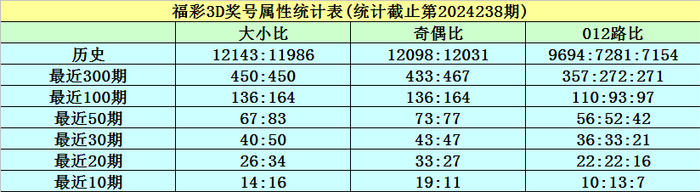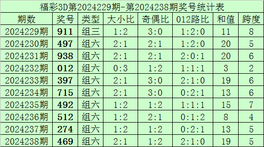 开奖回顾:福彩3D第2024238期奖号为469,其中奖号大小比为2:1,奇偶比为1:2,012路比为2:1:0,和值为19,跨度为5。