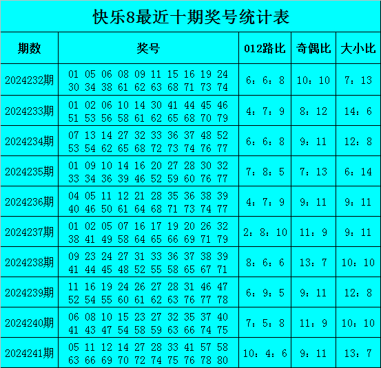 福彩快乐8第2024241期开奖回顾:05 11 12 14 27 28 33 41 57 58 63 66 69 70 72 74 75 76 78 80,其中奖号012路比为10:4:6,0路号码表现活跃。
