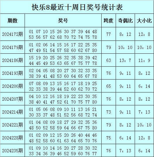 福彩快乐8第2024235期开奖回顾:01 09 10 14 16 20 27 28 30 32 33 34 36 39 46 52 59 60 76 77,其中奖号奇偶比为7:13,大小比为6:14,012路比为7:8:5,首尾间距为76。
