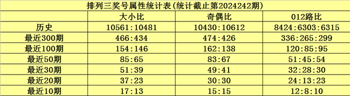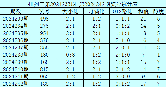 上期回顾:排列三第2024242期奖号为188,奖号012路比为0:1:2,奇偶比为1:2,大小比为2:1,和值为17,跨度为7。