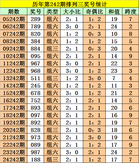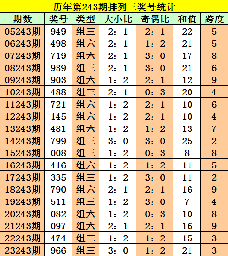 历年第243期排列三奖号:949 - 498 - 719 - 939 - 903 - 488 - 721 - 145 - 481 - 799 - 008 - 416 - 335 - 790 - 511 - 082 - 097 - 474 - 966。