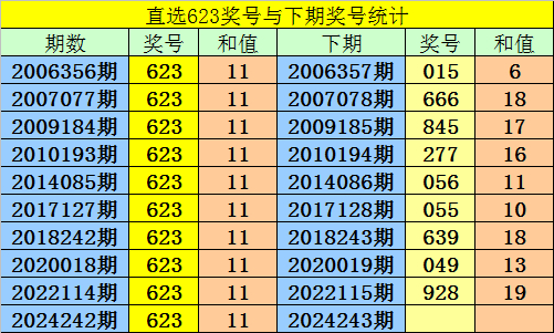 第2024242期3D奖号为:623,历史上该号码直选开出10次,下期号码分别为:015、666、845、277、056、055、639、049、928。