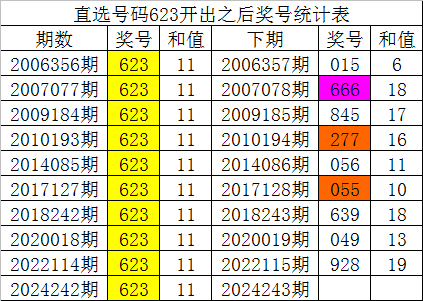 福彩3D第2024242期开出直选号码为:623,该直选号码历史上出现了10次,其下期分别开出了号码:015、666、845、277、056、055、639、049、928,如图: