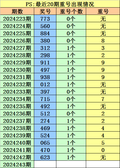 最近100期开奖中,含有重号的奖号有60期,最近20期含有重号的奖号有13期,最近10期含有重号的奖号有7期。本期注意重号落号。
