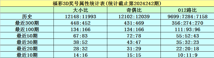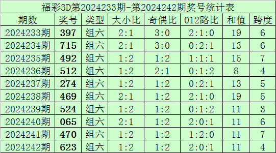 开奖回顾:福彩3D第2024242期奖号为623,其中奖号大小比为1:2,奇偶比为1:2,012路比为2:0:1,和值为11,跨度为4。
