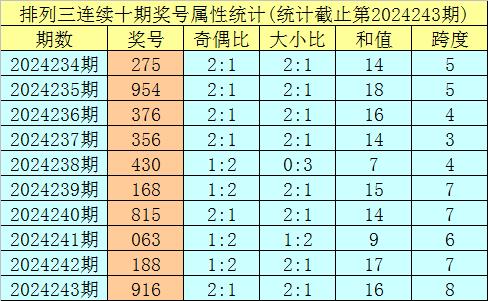上期回顾:排列三第2024243期奖号:916。类型:组六,奇偶形态:奇奇偶,大小形态:大小大,和值:16,跨度:8。